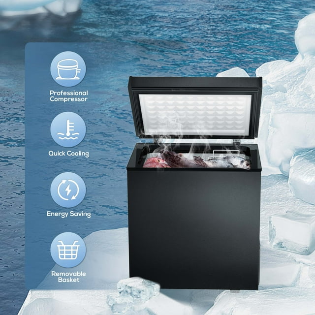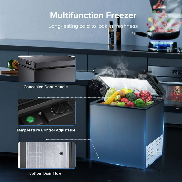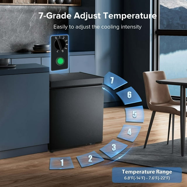 - 🍸Precise Temperature Control:Enjoy precise control over your freezing needs with the 7-level temperature settings of this chest freezer. You can easily adjust the temperature from mild chilling (level 1) to ultra-low freezing (level 7). The temperature range spans from 6.8 ℉ to -7.6 ℉, allowing you to customize the conditions for optimal food preservation.