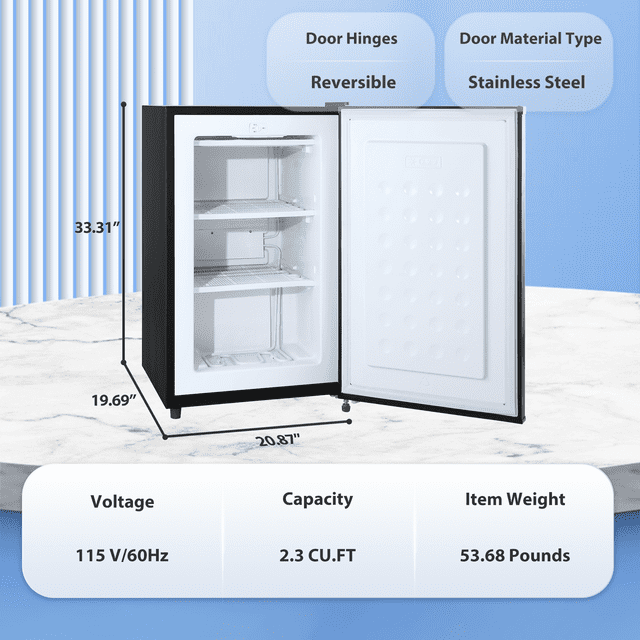 Auseo 2.3 cubic feet compact vertical freezer brings coolness to your summer and keeps your food fresh. This 2.3-cubic-foot compact vertical freezer has a stylish and simple shape, and a door handle is designed for easy opening. Large-capacity space allows you to store the daily food, drinks, ice cream, etc., and set it to a suitable temperature as needed. It can be perfectly integrated into every space: kitchen, office, restaurant, dormitory and apartment. This ideal freezer has these characteristics: 1. Retro Door Handle 2. Adjustable Feet 3. Adjustable Temperature Setting 4. Energy-Saving Compressor, Low Noise Work 5. Strong Cooling Effect 6. Removable Shelf 7. Reversible Door About Product Information: Color: Black Voltage: 110 Volts (AC) Door Material Type: Stainless Steel Installation Type: Freestanding Capacity: 2.3 Cu.ft Item Weight: 53.68 Pounds Dimensions: 19.69 x 20.87 x 33.31 inches