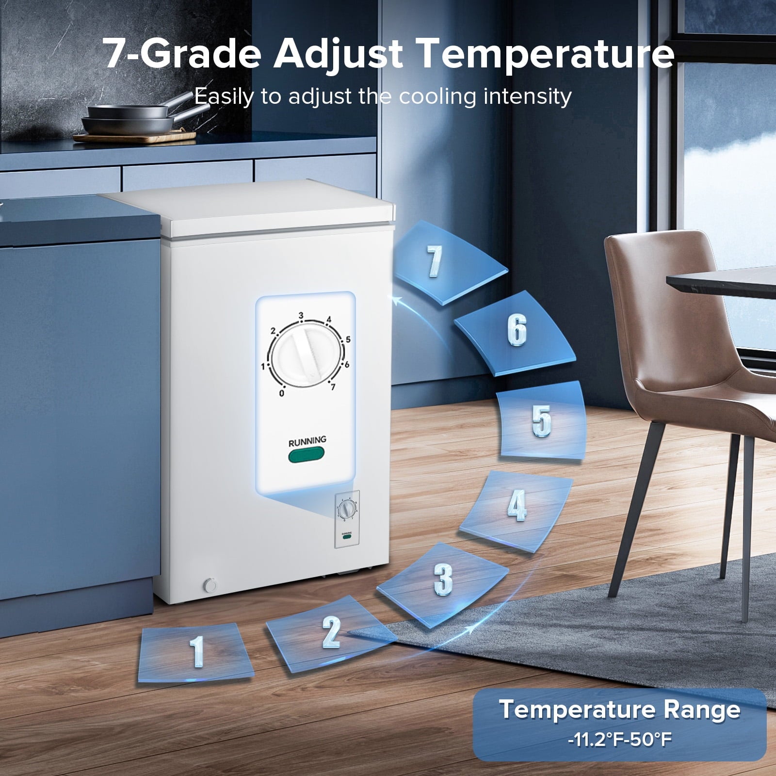 - 7-level temperature settings for precise control, ranging from 6.8 ℉ to -7.6 ℉
