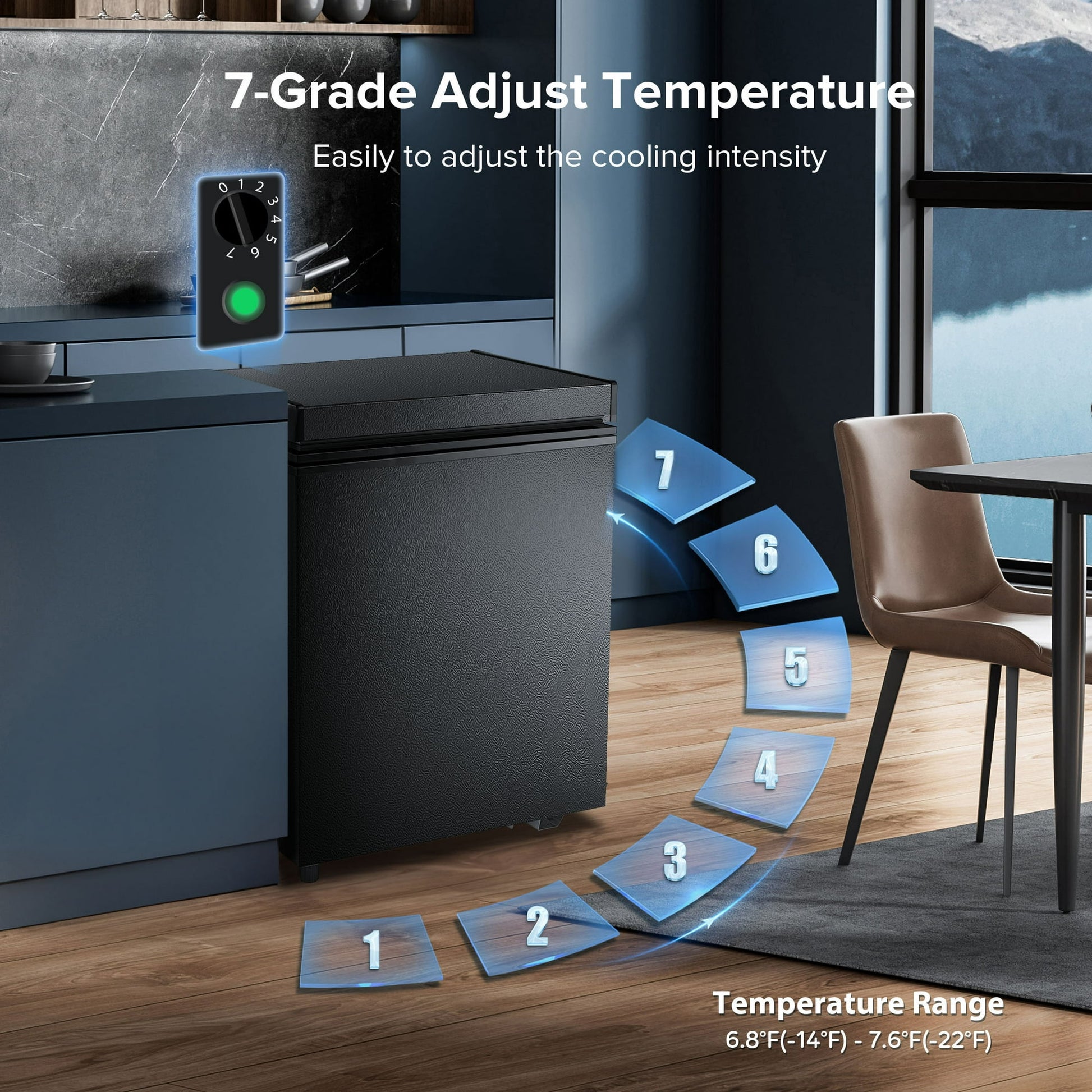 🍸Precise Temperature Control: Enjoy precise control over your freezing needs with the 7-level temperature settings of this chest freezer. You can easily adjust the temperature from mild chilling (level 1) to ultra-low freezing (level 7). The temperature range spans from 6.8 ℉ to -7.6 ℉, allowing you to customize the conditions for optimal food preservation.