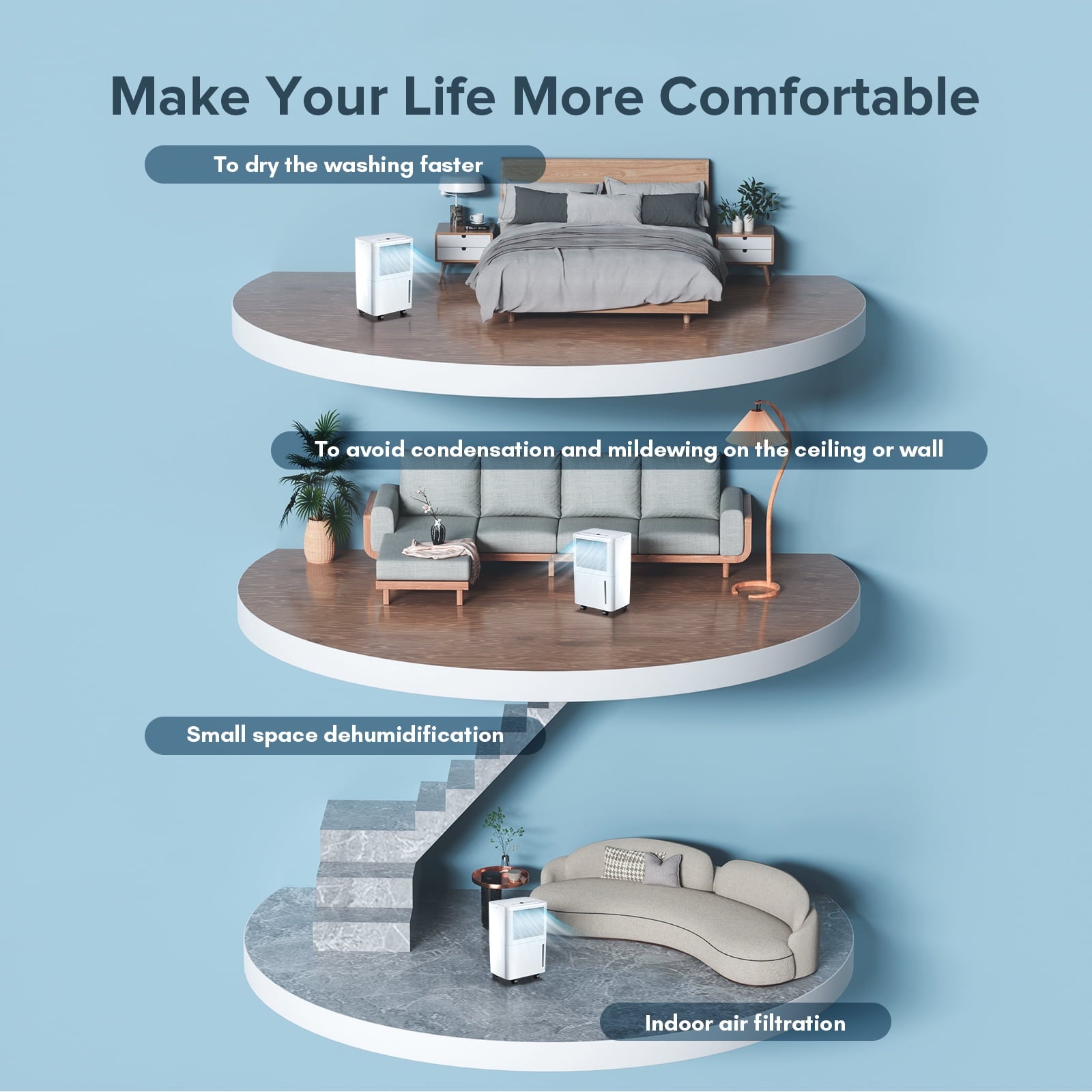 🌬️【Efficient Multi Dehumidifiers for Small Spaces】- Auseo Dehumidifiers are designed for areas up to 538 Sq.Ft, making them perfect for basements, offices, bathrooms, bedrooms, kitchens, stockrooms, living rooms, laundry rooms, cellars, and more. With a maximum moisture removal capacity of up to 22 pints per day, our dehumidifiers effectively reduce humidity levels from 30% to 80%.