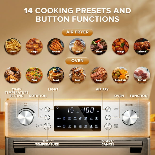 【14 preset cooking options】 Our product offers 14 preset cooking options, achieving the integration of air fryer and oven. The air fryer button can cook chicken wings, fish, French fries, etc., while the oven button can cook pizza, toast, cake, etc. You can cook the food you want according to your own needs.