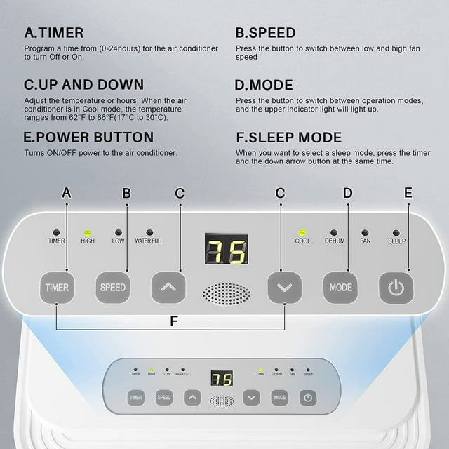 EASY TO OPERATE: The size of the compact and portable air conditioner is 13.7*14*27.6 inches could save space. Our air conditioner with the LED control panel at the top is easy to operate. Just Press POWER to turn the unit on and choose the mode which you like. The Up/Down button to adjust the temperature between 61℉ and 90℉. Then you could enjoy the coolness that blows to every corner.