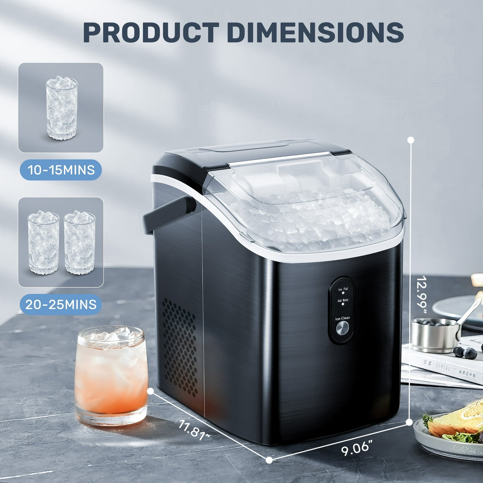 - π«[Compact & portable] Our ice maker is only 12.99*11.81*9.06 inches, which is suitable for any space such as kitchen or party. Equipped with handle, easy to move. The back is designed with an ice scoop bracket, which can easily store the ice scoop when not in use. Large transparent window can directly monitor the ice making process.
