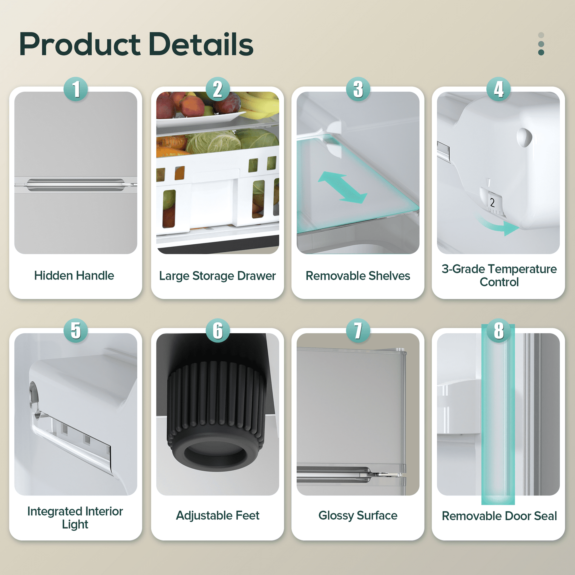 - 【User-Friendly Features】 Fridge with LED lights, adjustable feet for uneven surfaces, easy-close hinge, and recessed handle to prevent bumping.