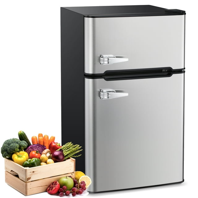 Auseo Double Door 3.2 Cu. ft Compact Refrigerator with Top Door Freezer, Freestanding Mini Fridge with Adjustable Temperature, Upright Freezer, Silver