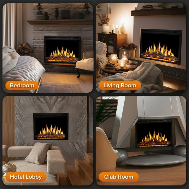Realistic Flame Effects—3 LED burning logs color modes: Red, Orange, Blue: The special automatic design is a big highlight design of this electric fireplace. The flame and LED bed color will be changed automatically and give your room a modern and amazing ambiance.