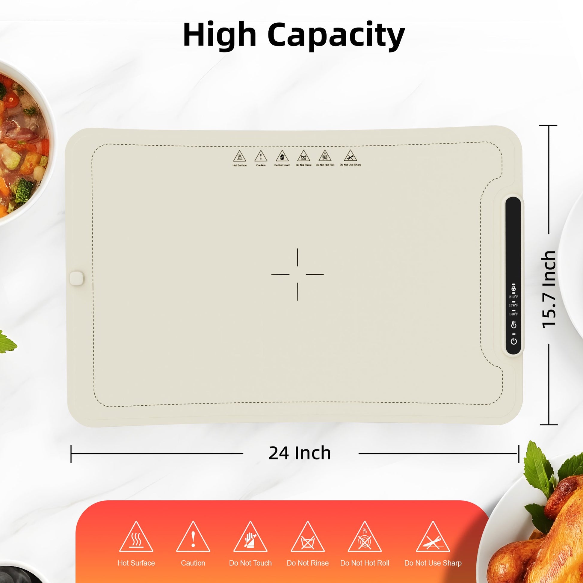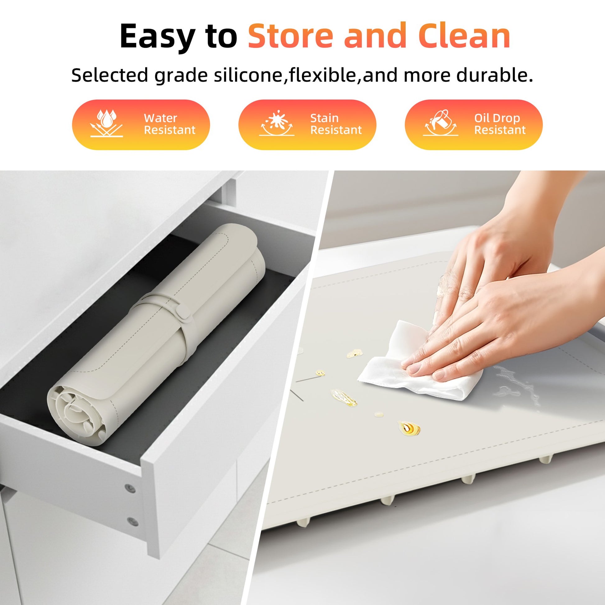 - 【Easy to Clean & Odor-Free】Made of high-quality flexible silica gel with an integrated molding process, it offers a comfortable and delicate touch while being durable. The nano-coated surface is splash-proof, oil-proof, and stain-proof—just a gentle wipe is enough for cleaning, eliminating post-meal cleaning troubles. Additionally, the food warming plate is crafted from food-grade materials, ensuring no peculiar smell, excellent flexibility, and easy roll-up storage. Simply roll it up and tie it, saving space neatly with excellent portability. Compact size: 15.7×24 inches (400×610 mm).