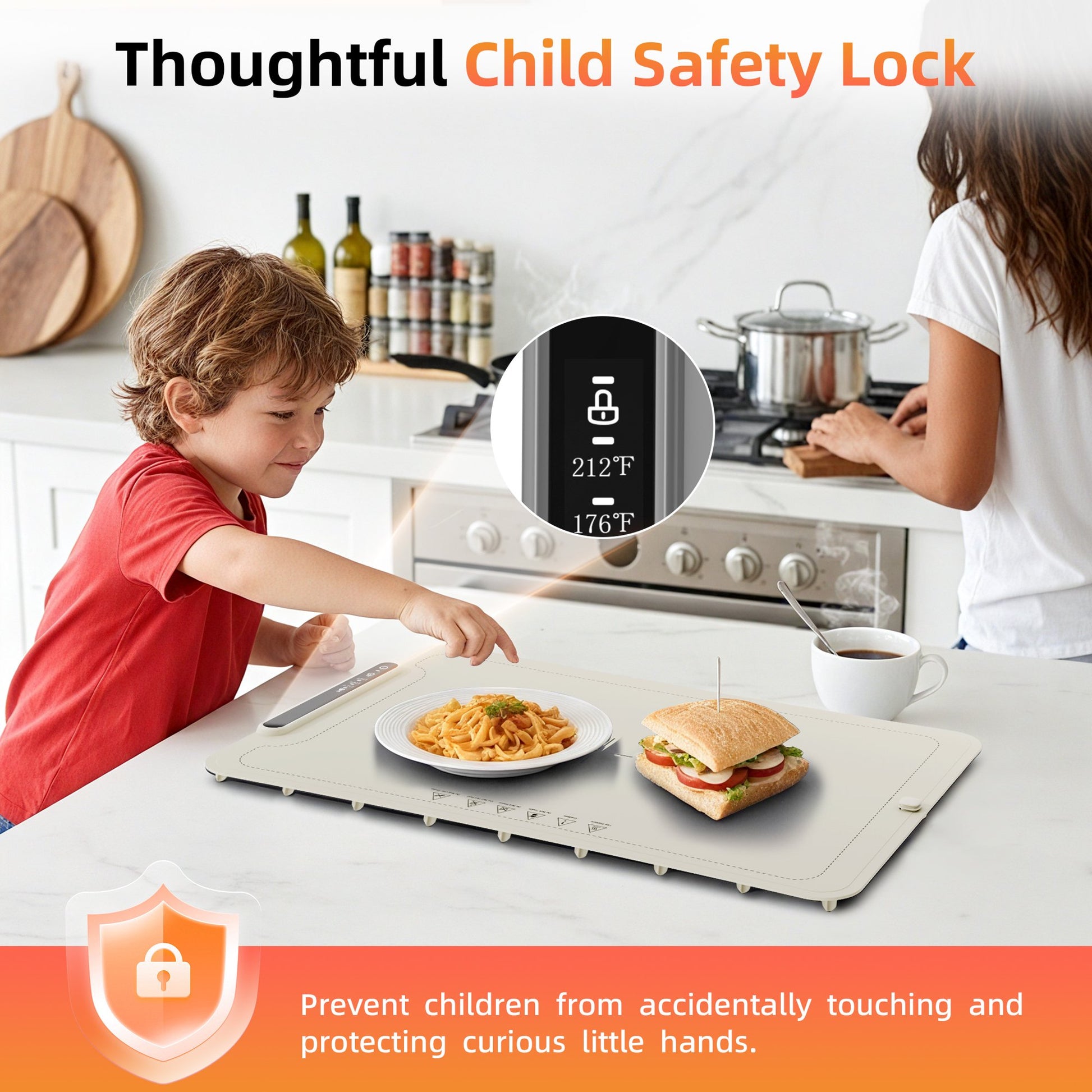 - 【Child Lock】Our warming plate is designed with more thoughtful details, including a considerate safety lock. This prevents accidental touches by children, ensuring the device operates safely when children are around.