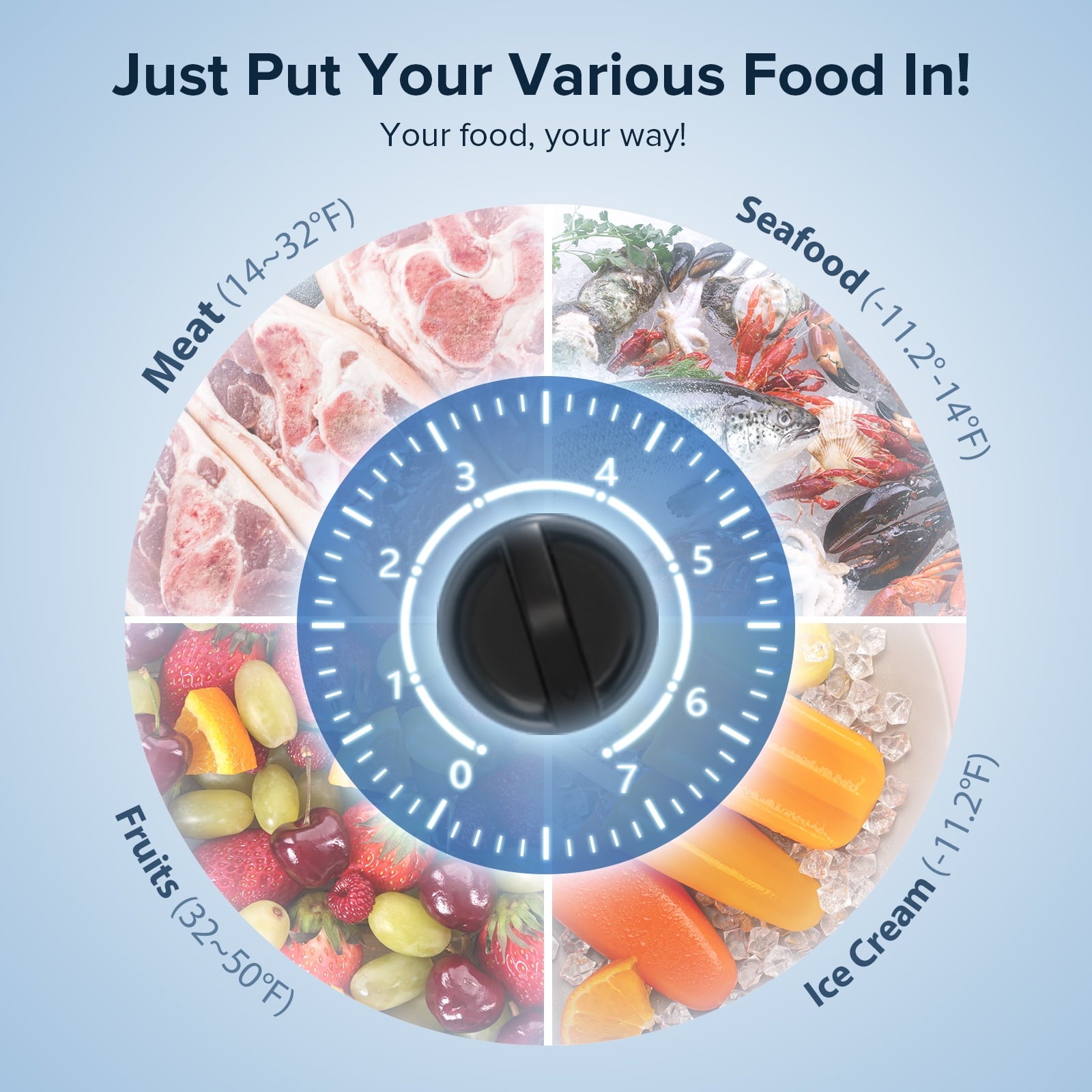 1. 7-SPEED TEMPERATURE ADJUSTMENT: The temperature of this freezer is divided into 7 speeds, the adjustment range from 6.8℉ to -7.6℉ provides you with absolute flexibility to choose between deep freezing (4-7) or normal freezing (1-3), you can turn the button according to the food.