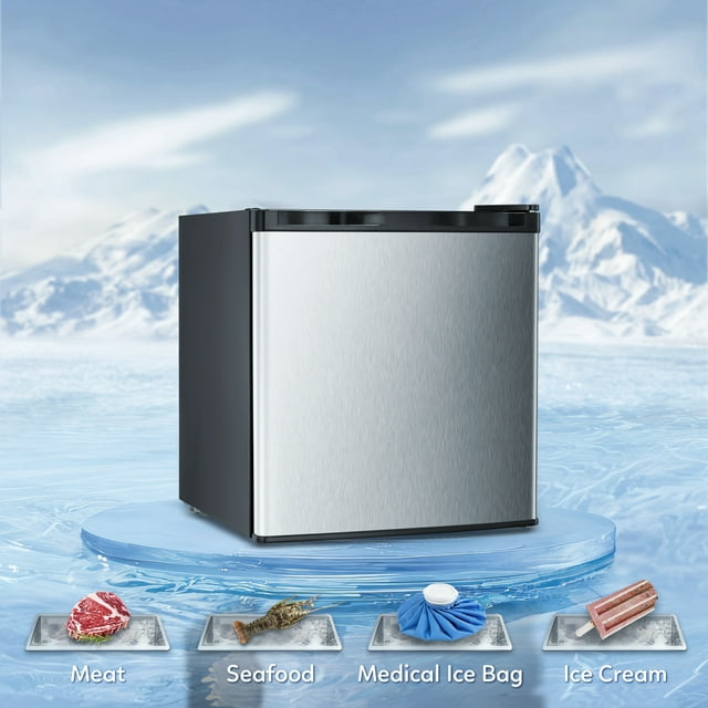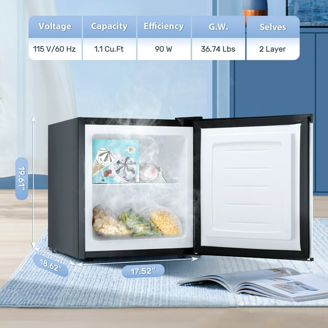 - 🍖 Upright Freezer Dimensions: 1.1 cubic feet free standing upright freezer, Measures: 17.5”(W)*18.62”(D)*19.61”(H). Compact Freezer saving design. Great using for breast milk, meat, aquatic products, cold drinks, quick-freezing and other purposes. It could for Home,Dorms,Kitchen and Office.