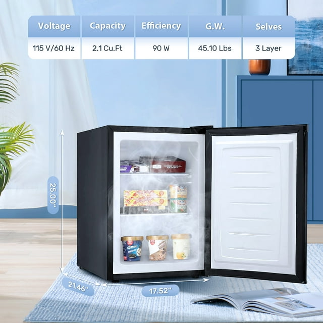 - 🍦Compact & Elegant Design:The Upright Freezer mini upright With 2 removable shelves and 2.1 cubic feet of capacity, the built-in three floors allow kitchen space, allowing you to keep all your frozen food nearby. Size: 17.5 L x 21.5 W x 25 H inches.