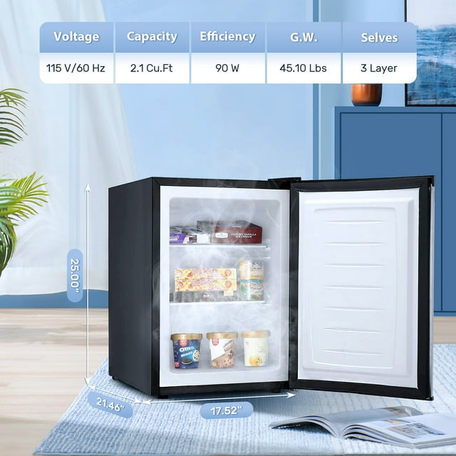 - 🍦Compact & Elegant Design:The Upright Freezer mini upright With 2 removable shelves and 2.1 cubic feet of capacity, the built-in three floors allow kitchen space, allowing you to keep all your frozen food nearby. Size: 17.5 L x 21.5 W x 25 H inches.