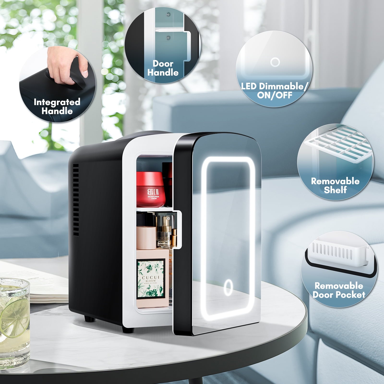 Introducing the mini fridge by Auseo – a fusion of functionality and style, offering a unique experience from all angles. This smart mini fridge not only boasts a beautiful exterior but also features a generous 4-liter capacity, accommodating 6 cans of beverages, snacks, vitamins, skincare, and makeup essentials. It ensures your cosmetics stay fresh and cool, while snacks and drinks maintain optimal temperature. The glass door of the fridge is equipped with LED lighting, providing illumination when using the fridge or applying makeup. Additionally, it comes with detachable dual-layer shelves and inner door storage, offering dedicated space beyond the main compartment. Operating quietly with minimal vibration using a standard household outlet (110V AC power), it is 100% CFC-free, energy-efficient, and environmentally friendly. Experience convenience and style with this mini beauty fridge – a must-have for any modern lifestyle!