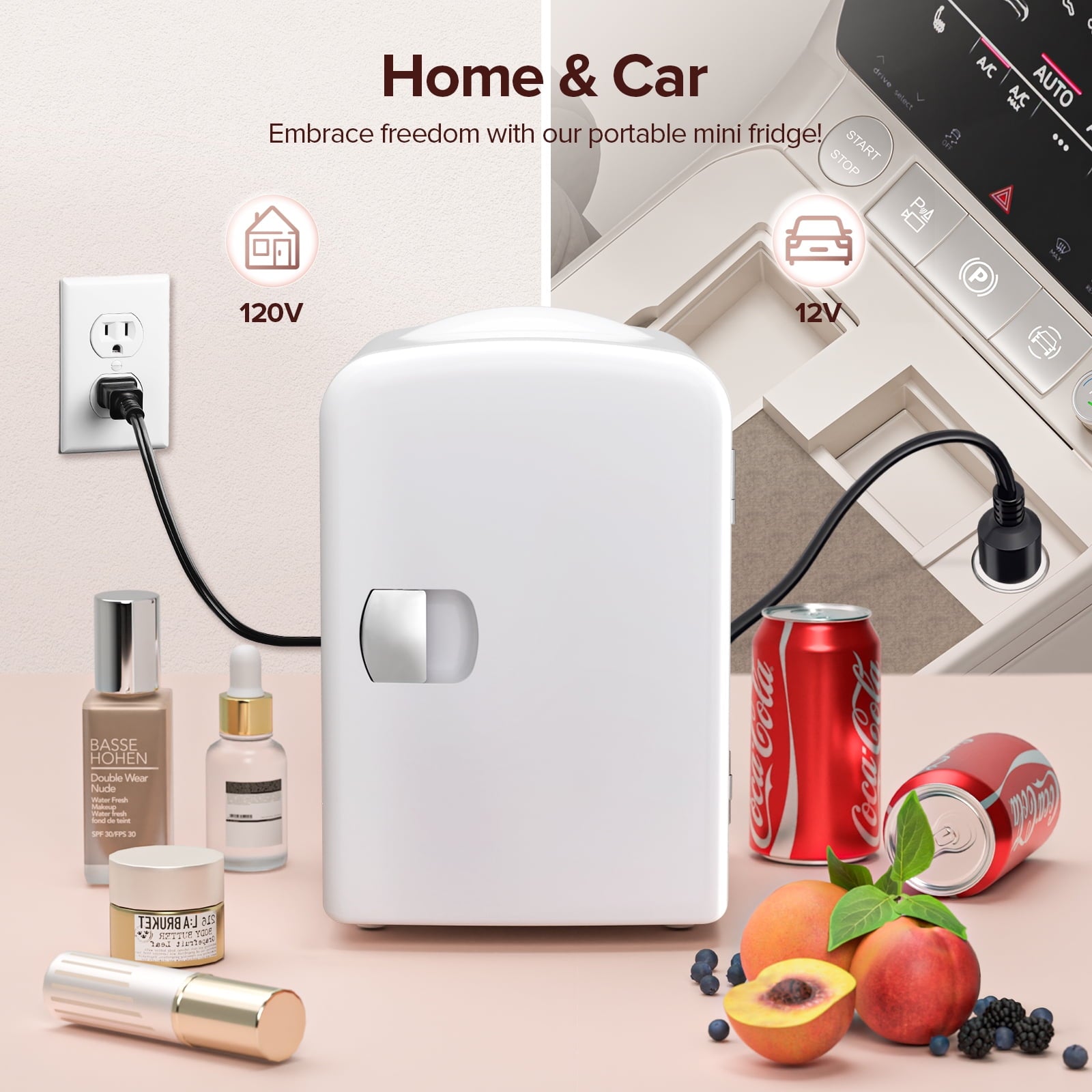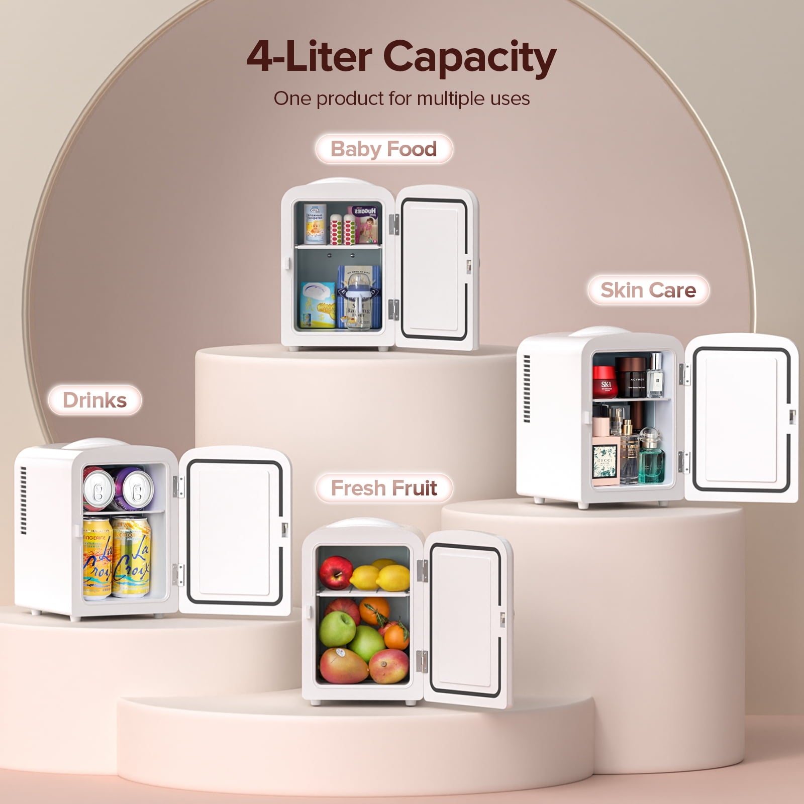 Auseo Mini Fridge and Personal Beauty Fridge, Portable 4 Liter, Cooler for Bedroom/Car/Office Desk/Dorm Room, 12V DC/120V AC, White