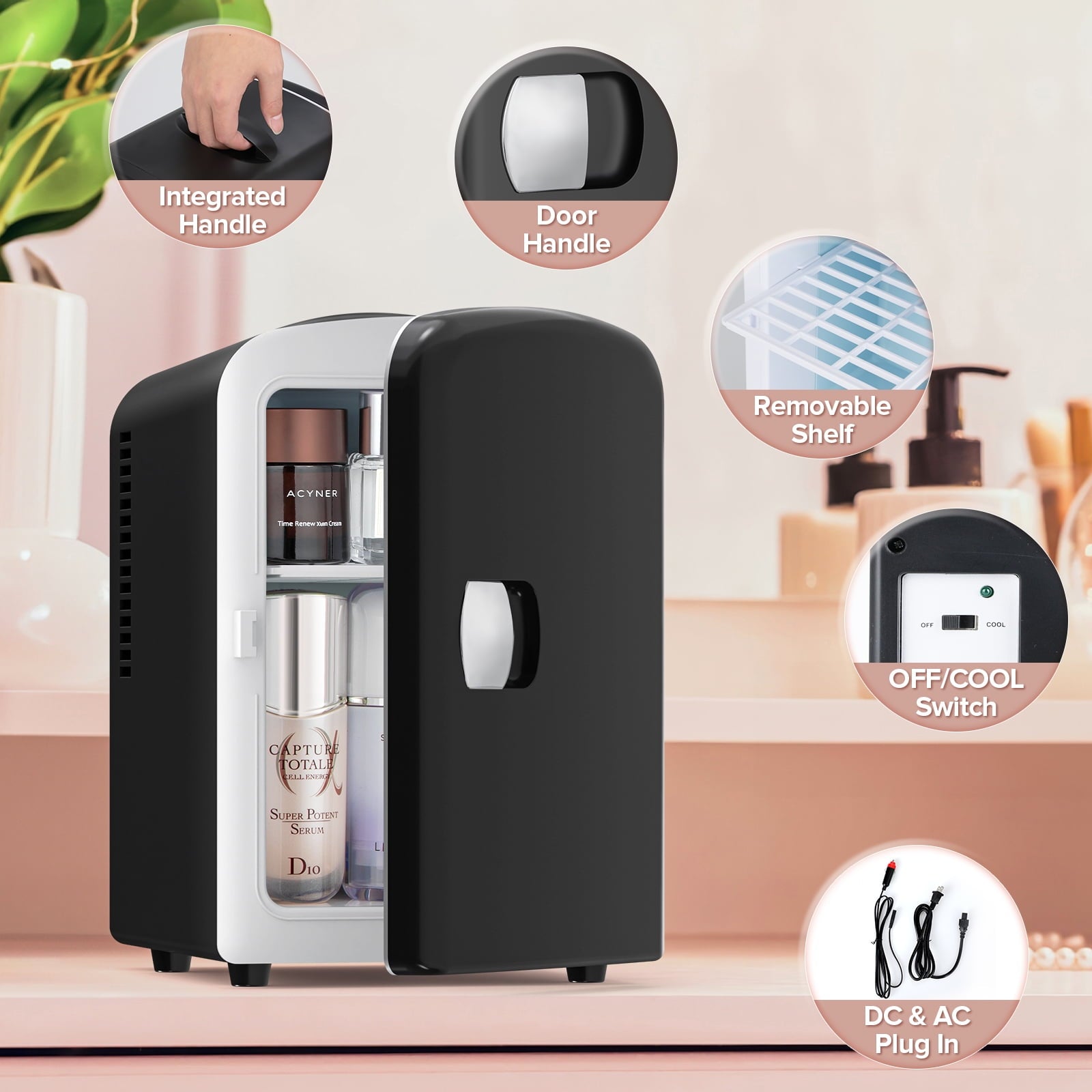 Auseo Mini Portable Fridge Personal, Countertop, 4L/6 Cans, Cooler Small Refrigerator, AC/DC, Option for Skincare, Makeup, Drinks, Dorm Room