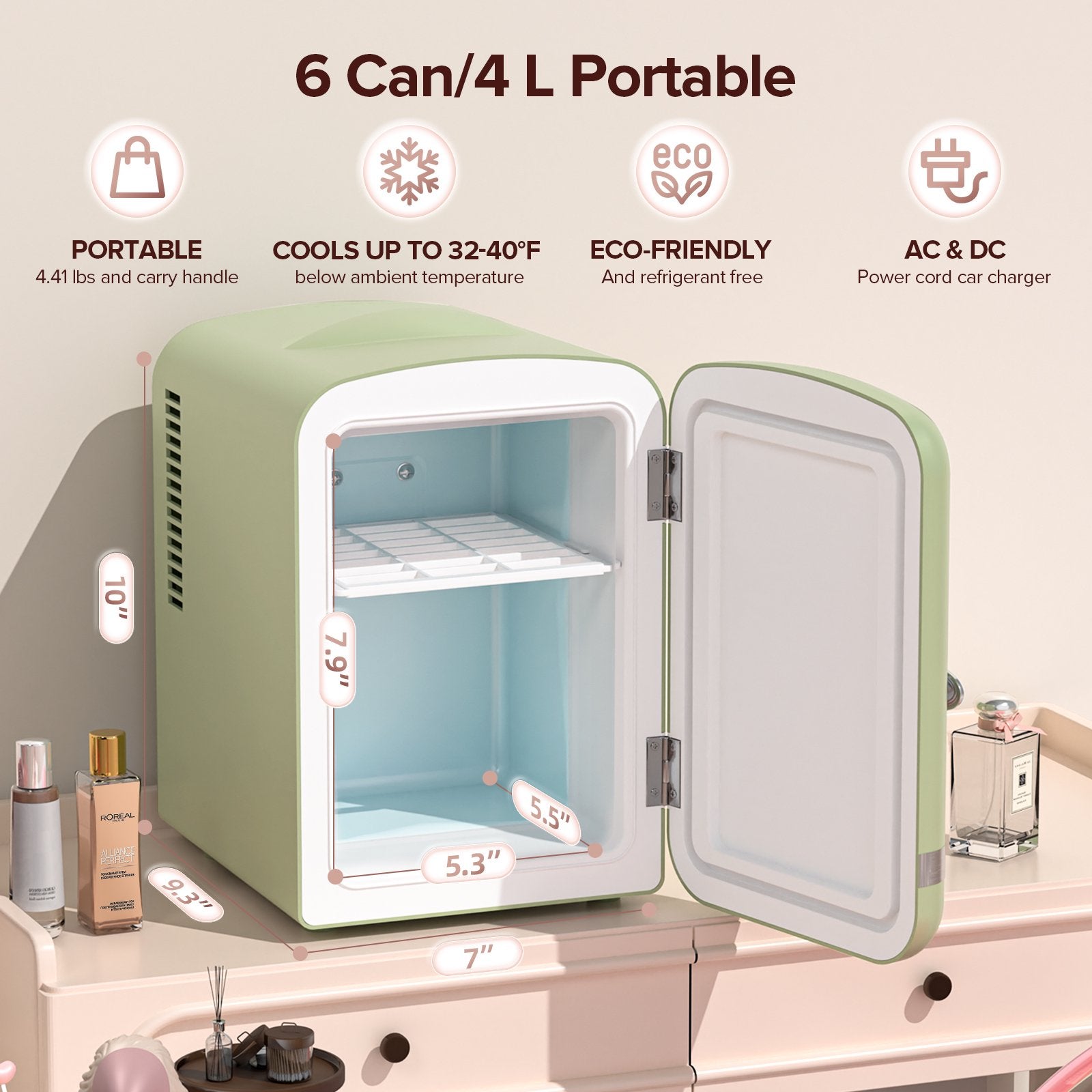 Mini Fridge Personal Beauty Refrigerator, 4 Liter, Includes Plugs for Home Outlet & DC Charger, Dorm, Bedroom, Table Top Beverage Cooler for Drinks, Soda, Wine - Green<br />