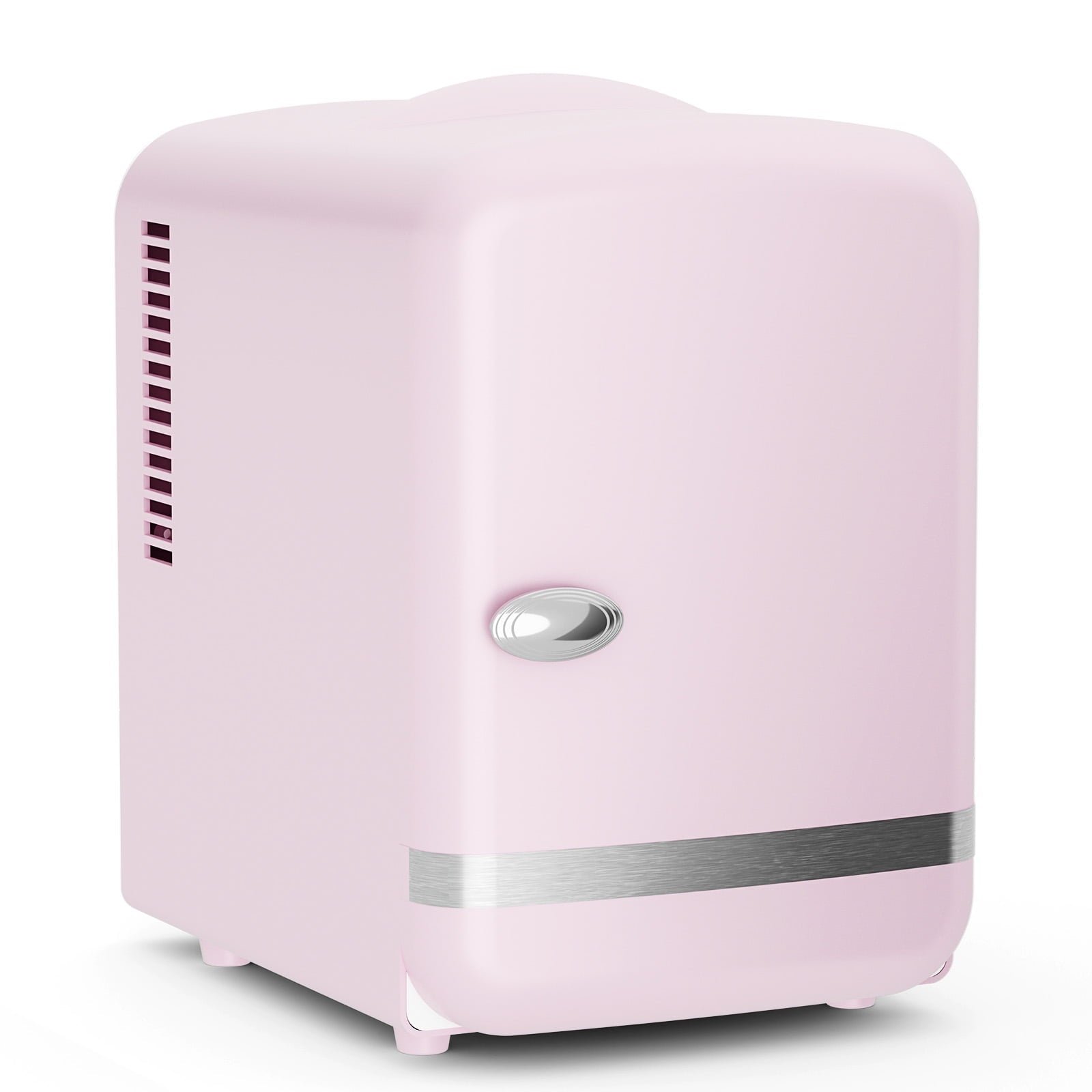 Auseo Mini Fridge Personal Beauty Refrigerator, 4 Liter, Includes Plugs for Home Outlet & DC Charger, Dorm, Bedroom, Table Top Beverage Cooler for Drinks, Soda, Wine - Pink